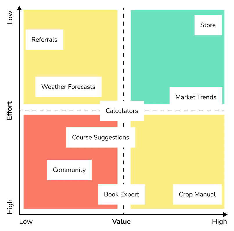With all requirements noted down, I collaborated with (read incessantly disturbed) the product team, customer team and the tech team to rank features by their value and effort.