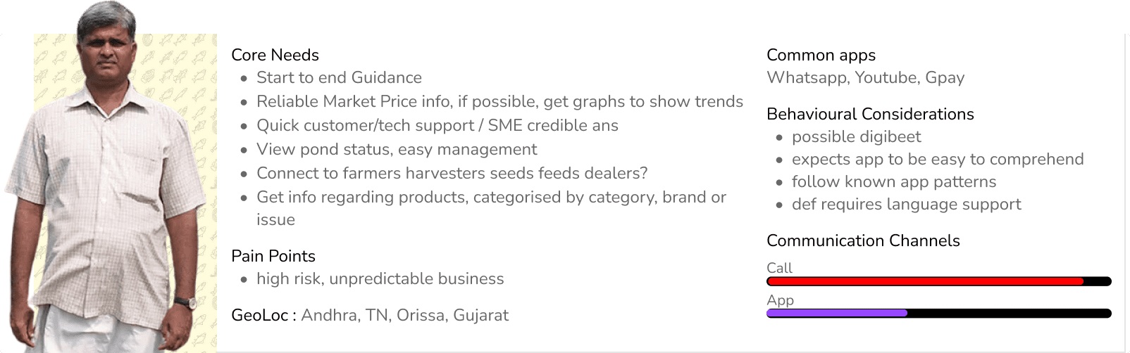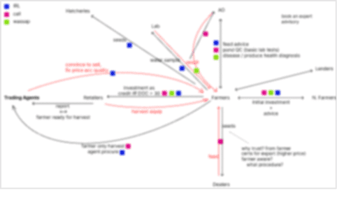 - I'd been given a briefing about every product under AquaConnect's full-stack solution (Incubators-Farmers-Banks/Lenders-Harvesters-Exporters) and that gave me a huge lead into understanding the big-picture. Though my focus was purely on the Farmers and creating an app that would add value to them without any significant financial gain, knowing the inter-dependencies between apps helped me conceptualize the complex network.