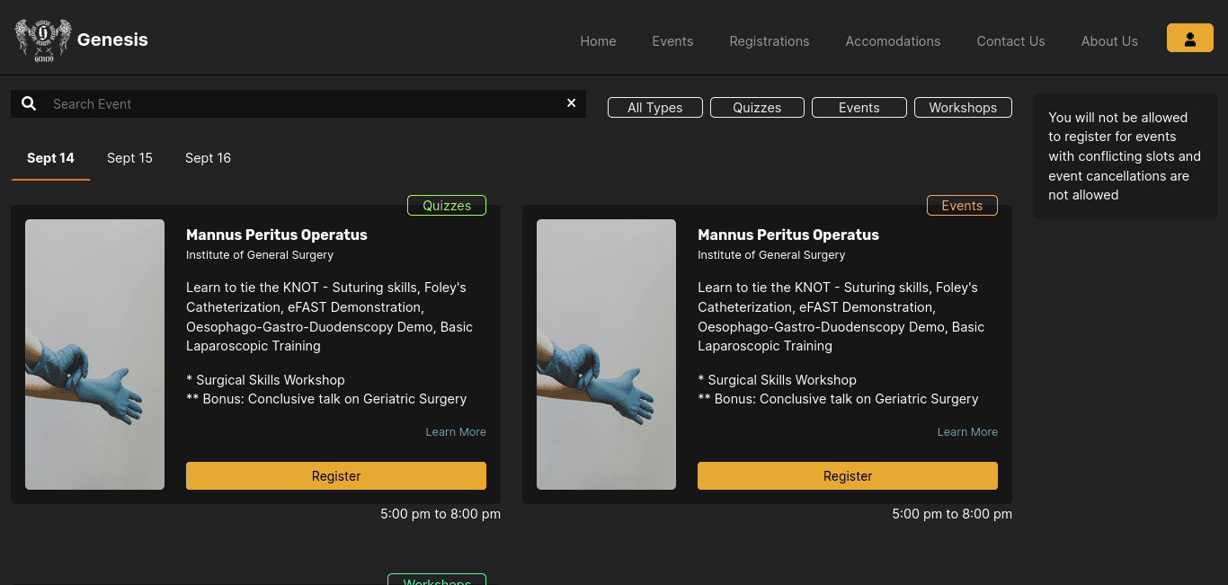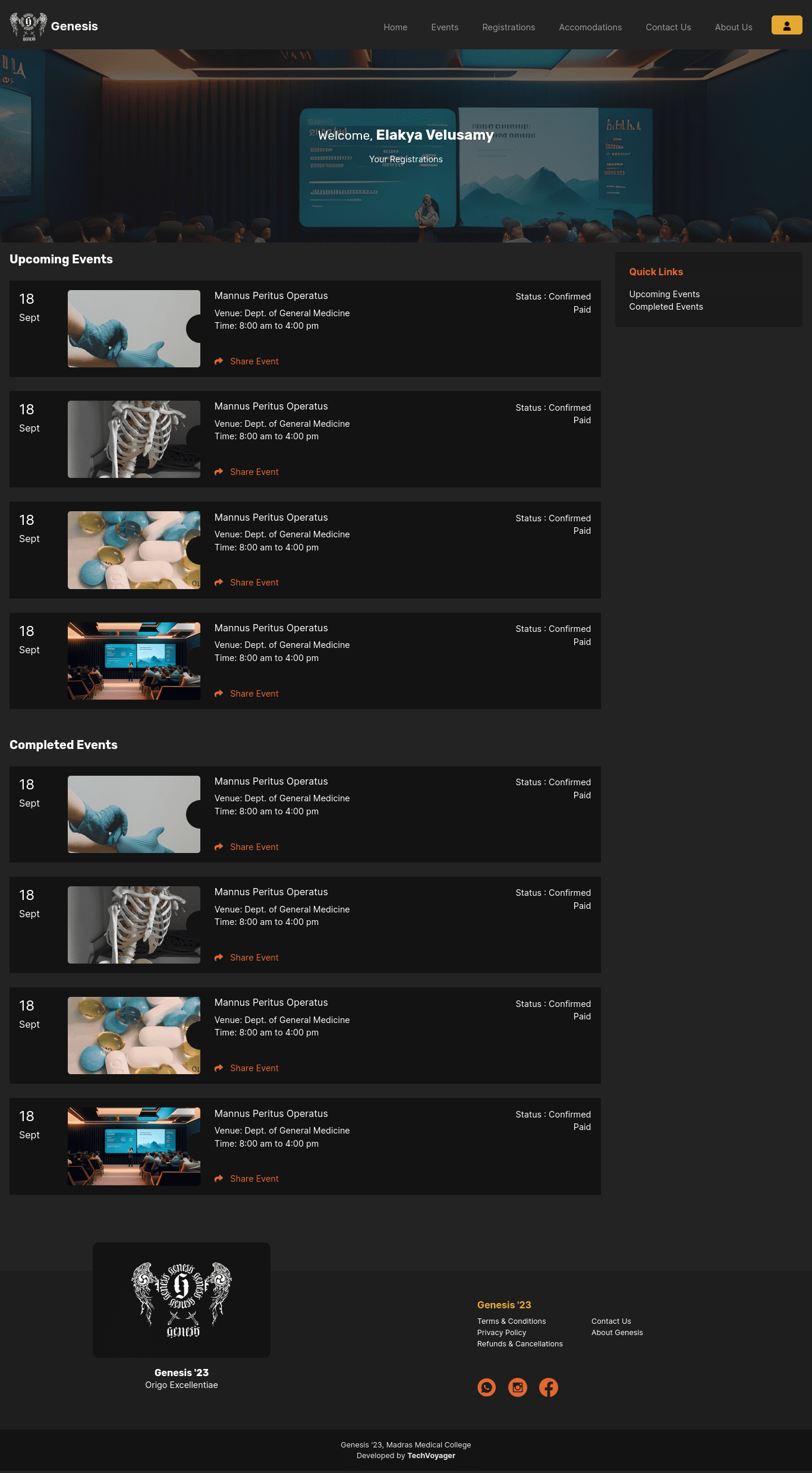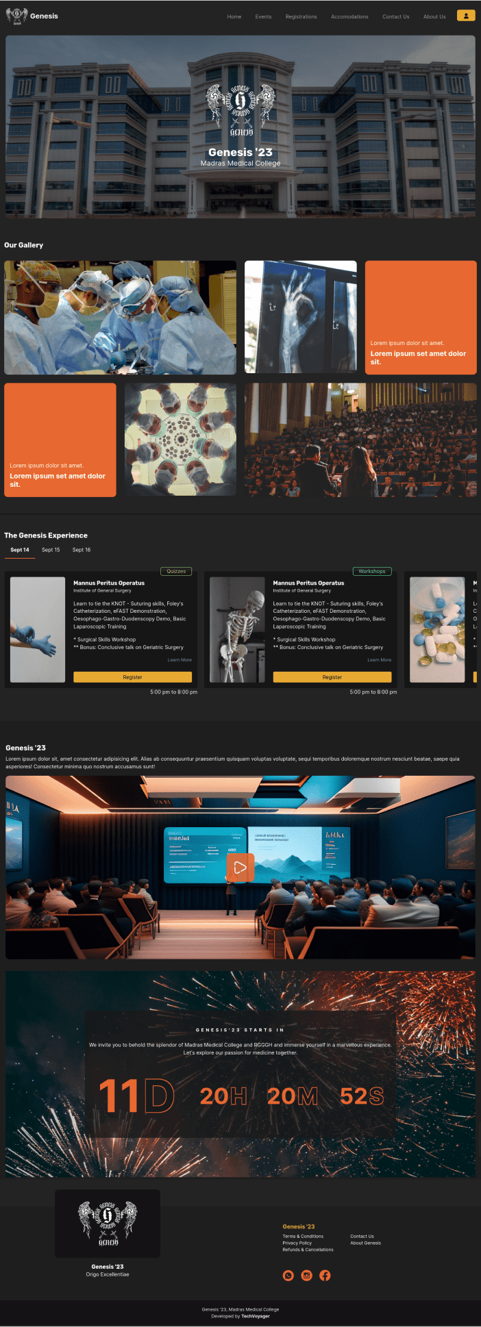 Overview: Genesis '23 was an event management web app designed for Madras Medical College's Annual Conference. Users would be using the app to get info on all the events conducted, pay for team or individual registrations and manage bookings.